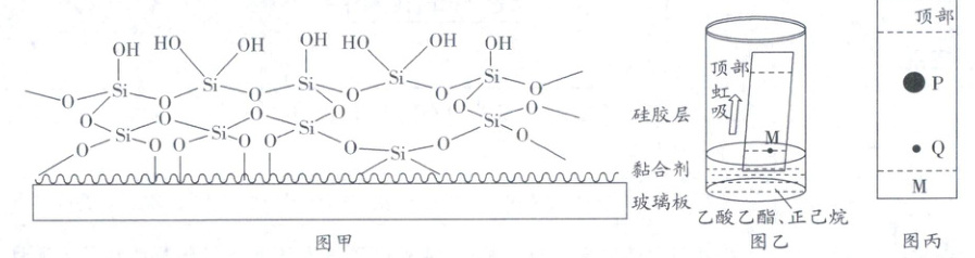 。(4)薄板层析在生化实验中应用广泛。薄板表面涂有硅胶,其剖面如图甲所示。取装置 A 内液体点在薄板 M 处,乙酸乙酯和正己烷的混合液带动样品在薄板上爬升时(图乙),由于硅胶层表面对安息香与二苯乙二酮吸附力强弱不同,因此爬升高度不同(图丙)。回答下列问题: