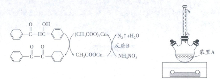 Ⅰ. 在 50 mL 装置 A 中加入 0.08 g (CH₃COO)₂Cu、2.40 g NH₄NO₃(过量)、4.24 g 安息香以及 18.0 mL 冰醋酸。