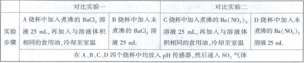 (4)根据变量控制思想,由实验一对比可知,B烧杯中加入未煮沸的$BaCl_2$溶液出现白色沉淀,而A烧杯煮沸的$BaCl_2$溶液未出现白色沉淀,说明是$O_2$氧化$SO_2$,故发生的反应为$2H_2SO_3 + O_2 \longrightarrow 2H_2SO_4$,因此B烧杯中出现浑浊的原因是$SO_2$被氧气氧化为$SO_4^{2-}$,$SO_4^{2-}$与钡离子反应产生白色沉淀,假设一成立。