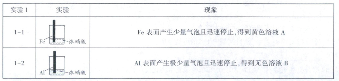 (1)反应迅速停止是因为浓硝酸具有酸性和性,可在${Fe}$和${Al}$表面形成致密的氧化层,阻止进一步反应。