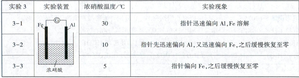 (3)①$30° C$时,Al与浓硝酸钝化速率比Fe的快,Fe不钝化;②依据3-2的实验现象:在$10° C$时,指针先迅速偏向Al,说明Al为正极未反应,Fe作负极溶解;又迅速偏向Fe,说明此时Fe作正极不消耗,而Al反而变为负极被消耗;之后缓慢恢复至零,说明Al和Fe表面都被钝化不再发生反应,反应停止。