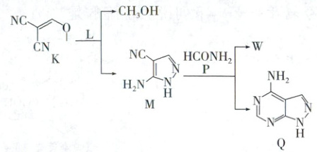 巩固训练6 D 解析:K中碳碳双键左侧的碳原子连了两个相同的基团(—CN),故不存在顺反异构,A正确;K的分子式为C₅H₄N₂O,甲醇分子式为CH₄O,M的分子式为C₄H₄N₄,根据原子守恒可知L的化学式为N₂H₄,B正确;K→M有—NH₂与—CN加成,M→Q中,HCONH₂断开N—H键和M中—CN发生加成反应,C正确;由已知生成Q时,M与HCONH₂中均有N—H键断裂,则Q中—NH₂上的N应为¹⁵N,D错误。