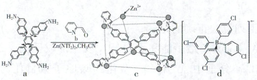 巩固训练 8 (2025·湖南常德一模)某团队提出了一种新的“伪立方体金属有机笼 c”设计,其设计如图(a→c)。d 是可容纳在 c 的空腔中的阴离子,其容纳在 c 中的作用力与冠醚识别碱金属离子的作用力相似。下列说法错误的是(