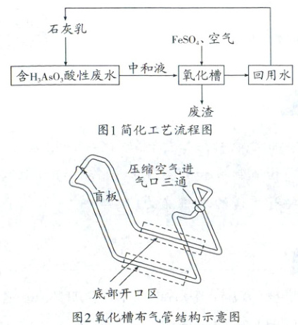 金属冶炼所产生的酸污水中的 As 元素可采用亚铁盐石灰法以 FeAsO₄ 形式去除,其简化工艺流程如图 1 所示,若采用三根压缩空气管直接将空气通入氧化槽内液体中,回用水发绿;改进后的氧化槽布气管结构如图 2 所示,盲板的作用为堵塞气体,使压缩空气只能从底部开口区逸出。下列说法正确的是(