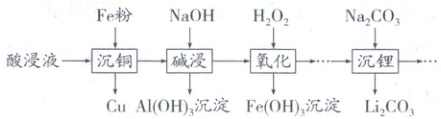 主要含$Li^+$、$Fe^{3+}$、$Cu^{2+}$、$Al^{3+}$的酸浸液中加入Fe粉沉铜,得到Cu,再加入NaOH碱浸,得到$Al(OH)_3$沉淀,把$Fe^{2+}$氧化为$Fe(OH)_3$沉淀,加入$H_2O_2$氧化,加入$Na_2CO_3$沉锂得到$Li_2CO_3$。