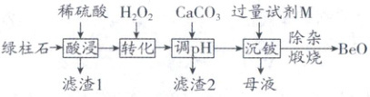 酸浸时得到$Fe^{2+}$(可能有$Fe^{3+}$)、$Al^{3+}$、$Be^{2+}$,$SiO_2$成为滤渣1,$H_2O_2$作氧化剂,把$Fe^{2+}$氧化为$Fe^{3+}$,加入碳酸钙调pH的目的是除去$Fe^{3+}$和$Al^{3+}$,得到氢氧化铁和氢氧化铝沉淀,加入氨水得到氢氧化铍,除杂、煅烧得到氧化铍。