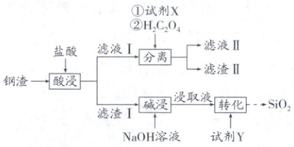 $Fe^{2+}$、$Fe^{3+}$、$Ca^{2+}$等①加入试剂X ②加入$H_2C_2O_4$,试剂X将$Fe^{2+}$氧化为$Fe^{3+}$,$H_2C_2O_4$使$Ca^{2+}$先沉淀,分离后,滤液Ⅱ含$Fe^{3+}$,滤渣Ⅱ$→CaC_2O_4$,钢渣经盐酸酸浸,得到滤液Ⅰ和滤渣Ⅰ,滤渣Ⅰ经碱浸,得到浸取液含$Na_2SiO_3$,加入试剂Y转化为$H_2SiO_3$沉淀,最后转化为$SiO_2$。