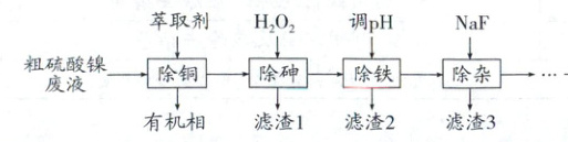 粗硫酸镍废液中加入有机萃取剂分离出含铜离子的有机相,水相中加入过氧化氢氧化亚铁离子为铁离子,氧化三价砷为五价砷,铁离子使得砷转化为FeAsO₄沉淀;滤液调节pH使得剩余铁离子转化为氢氧化铁沉淀得到滤渣2,滤液加入NaF使得钙离子、镁离子转化为氟化钙和氟化镁沉淀得到滤渣3,滤液处理得到NiSO₄·6H₂O。