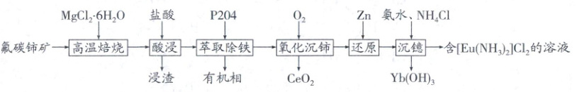 以氟碳铈矿为原料提取稀土元素的工艺流程为:先将氟碳铈矿加入MgCl₂·6H₂O混合高温焙烧,再将焙烧后的物质加盐酸酸浸,其中稀土元素和Fe₂O₃转化为离子,过滤进行分离,难溶于盐酸的SiO₂和MgF₂形成浸渣除去,舍弃稀土金属离子和Fe³⁺的滤液,加入P204有机萃取剂进行萃取除铁得到含稀土金属离子的水相溶液,通入O₂将Ce元素氧化为CeO₂过滤除去,剩余液体中加单质Zn为Eu³⁺还原为Eu²⁺后,再加入氨水和NH₄Cl沉淀铕元素为Yb(OH)₃过滤分离,最后得到含[Eu(NH₃)₂]Cl₂的溶液。