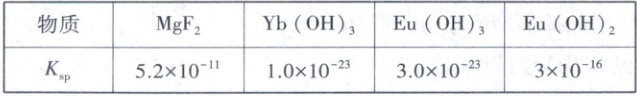 (5)根据已知表格的溶度积常数可知:$K_{sp}[Yb(OH)_{3}]=1.0×10^{-23}$与$K_{sp}[Eu(OH)_{3}]=3.0×10^{-23}$比较接近,而$K_{sp}[Eu(OH)_{2}]=3.0×10^{-16}$大得多,所以不将Eu³⁺还原为Eu²⁺即缺少“还原”步骤,则在浸镱时会出现Yb³⁺和Eu³⁺共沉淀,无法分离的情况。