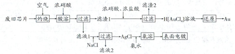 废旧芯片(主要成分为单晶硅,还含有塑料和少量Ag、Au、Cu、Pd等金属)灼烧去除塑料等有机杂质,得到Ag₂O、CuO、PdO、Au、Ag残渣,用浓硝酸酸溶,得到含Cu²⁺、Ag⁺、Pd²⁺的滤液1,Au和Si不溶于浓硝酸而存在于滤渣1中,滤渣1用浓硝酸和浓盐酸的混合物浸取,Au转化为[AuCl₄]⁻,Si不溶存在于滤渣2中,用还原剂可以将[AuCl₄]⁻还原为Au,滤液1中加入NaCl,得到AgCl沉淀,用氨水溶解AgCl得到[Ag(NH₃)₂]⁺。