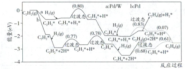 (2)由题图可知,选择Pd作催化剂时,生成乙烷的活化能低于选择Pd/W作催化剂时的(0.68<0.83),说明使用Pd作催化剂,乙烯更容易转化为乙烷,使乙烯的选择性更小,故Pd/W作催化剂时,乙烯的选择性更高。