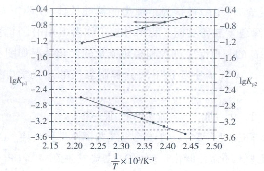 得到 lg Kₚ₁ ~ 1/T 和 lg Kₚ₂ ~ 1/T 均为线性关系,如下图所示: