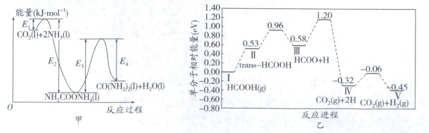 反应 ii(填“大于”或“小于”)。(2)(2025·河南信阳二模节选)甲酸被认为是理想的氢能载体,江西正着力建设“赣鄱氢经济走廊”,打造“氢清江西”绿色发展新功能。我国科技工作者运用 DT 计算研究单分子 HCOOH 在催化剂表面分解产生 H₂ 的一种反应进程和相对能量的变化情况如图乙所示。该进程中,反应速率最慢的步骤为