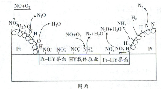 (3)(2024·河北保定一模节选)近年来,以清洁的氢气选择性催化还原 NOₓ 引起研究者的青睐,某研究以贵金属 Pt 为主要催化剂,催化还原 NOₓ 主要发生在金属(Pt)表面、金属与载体界面(Pt-HY)和载体(HY)表面,反应机理如图丙所示。在金属 Pt 表面,NO 被还原为