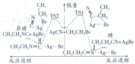 AgCN与CH₃CH₂Br可发生取代反应,反应过程中CN⁻的C原子和N原子均可进攻CH₃CH₂Br,分别生成腈(CH₃CH₂CN)和异腈(CH₃CH₂NC)两种产物。通过量子化学计算得到的反应历程及能量变化如图(TS为过渡态,Ⅰ、Ⅱ为后续物)。