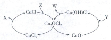 分析流程图,我们要注意物质的变化状况和反应流程主体外的其他物质。CuO和$\mathrm{Cu(OH)Cl}$相比多出了H和Cl元素,可以推测加入的Y为HCl,$\mathrm{Cu(OH)Cl}$相对于$\mathrm{Cu_2OCl_2}$少了H和O元素,可以推测W为$\mathrm{H_2O}$。