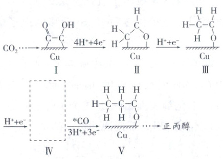 $\mathrm{CO_2·s \overset{O}{\overset{||}{C}}-C-OH+4H^++4e^-\rightarrow H-\overset{H}{\overset{|}{C}}-C-OH+H^++e^-\rightarrow H^++e^-\rightarrow *CO+3H^++3e^-\rightarrow 正丙醇}$ (其中中间过程图示含Cu催化作用)