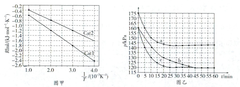 ①一定温度下,向密闭容器中充入适量PCl₃(g)和Cl₂(g),实验测得在催化剂Cat1、Cat2作用下,Rlnk与1/T的关系如图甲所示。催化效能较高的是
