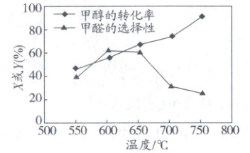 一定条件下测得相同时间内温度对甲醇的转化率(X)、甲醛的选择性(Y)的影响如下图所示[甲醛的选择性(Y)=n(生成的HCHO)/n(转化的CH₃OH)×100%]。550~750℃时,推测甲醛选择性变化的原因是