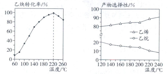 (1)一定条件下,使用某含 Co 催化剂,在不同温度下测得乙炔转化率和产物选择性(指定产物的物质的量/转化的乙炔的物质的量)如图所示(反应均未达平衡)。