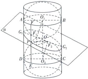 设椭圆长半轴长为$a$,半焦距为$c$,设$O$为$O_1O_2$的中点,$PF_1$与球$O_1$切于点$F_1$,$O_1F_1 \perp \alpha$,$O_1F_1 \subset \alpha$,故$O_1F_1 \perp OF_1$,有$|O_1F_1|^{2} = |OO_1|^{2} - |OF_1|^{2} = a^{2} - c^{2} = b^{2}$,则$2b = 2|O_1F_1|$,即椭圆的短轴长与嵌入圆柱的球的直径相等,故A正确。