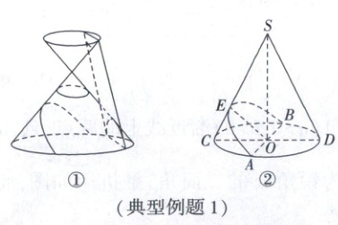典型例题 1. (2025·辽宁沈阳二模)古希腊数学家阿波罗尼斯采用平面切割圆锥面的方法来研究圆锥曲线,如图①,设圆锥轴截面的顶角为 $2\alpha$,用一个平面 $\Gamma$ 去截该圆锥面,随着圆锥的轴和 $\Gamma$ 所成角 $\beta$ 的变化,截得的曲线的形状也不同。据研究,曲线的离心率为 $e = \frac{\cos \beta}{\cos \alpha}$,比如,当 $\alpha = \beta$ 时,$e = 1$,此时截得的曲线是抛物线。如图②,在底面半径为 $1$,高为 $2\sqrt{2}$ 的圆锥 $SO$ 中,$AB$,$CD$ 是底面圆 $O$ 上互相垂直的直径,$E$ 是母线 $SC$ 上一点,$SE = 2EC$,平面 $ABE$ 截该圆锥面所得的曲线的离心率为( )