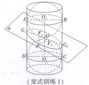 变式训练1.D解析:设$P$为截口曲线的椭圆的一点,如图,过点$P$作线段$EF$分别与球$O_1$,$O_2$切于点$F$,$E$,故有$|PF_1| + |PF_2| = |PF| + |PE| = |EF| = |O_1O_2|$,由椭圆定义可知,该椭圆以$F_1$,$F_2$为焦点,$|O_1O_2|$为长轴长,故B正确。