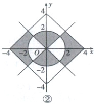 所以满足$f \leq 0$且$g \leq 4$的点$(x,y)$构成的区域$\Gamma$如图①阴影部分所示。