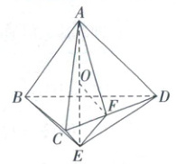 设OG=x,GF=a,则AG=2+x,GE=2-x,GD=2a,DC=2DF=2√3 a,在△ODG中,OG²+DG²=OD²,得4a²=4-x²,在△GFA中,tan∠AFG=AG/GF=(2+x)/a,同理tan∠EFG=EG/GF=(2-x)/a,tan∠AFE=tan(∠AFG+∠EFG)=(tan∠AFG+tan∠EFG)/(1-tan∠AFG tan∠EFG)=((2+x)/a+(2-x)/a)/(1-((2+x)/a)((2-x)/a))=(4/a)/(1-(4-x²)/a²)=-4√3/3,化简得a/(4-x²)=4√3/3,代入4a²=4-x²,可得a=√3/3,故DC=2,几何体的体积为$V_{A-BCD}+V_{E-BCD}=1/3×AE×S_{△BCD}=1/3×AE×(√3/4)×DC²=4√3/3。$
