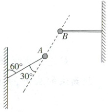 1. (2025·湖南卷)如图,两带电小球的质量均为$m$,小球$A$用一端固定在墙上的绝缘轻绳连接,小球$B$用固定的绝缘轻杆连接。$A$球静止时,轻绳与竖直方向的夹角为$60^{\circ}$,两球连线与轻绳的夹角为$30^{\circ}$,整个系统在同一竖直平面内,重力加速度大小为$g$。下列说法正确的是(