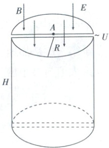 (2023·湖南长沙二模)现有一对半圆柱体回旋加速器置于真空中,如图所示,其半径为 $R$,高度为 $H$,两金属盒半圆柱体间狭缝宽度为 $d$,有垂直于盒面向下、磁感应强度大小为 $B$ 的匀强磁场和垂直于盒面向下、电场强度大小为 $E$ 的匀强电场,磁场仅存在于两盒内,而电场存在于整个装置,两盒间接有电压为 $U$ 的交流电。加速器上表面圆心 $A$ 处有一粒子发射器,现有一电荷量为 $+q$、质量为 $m$ 的粒子从 $A$ 点飘入狭缝中,初速度可以视为零。不考虑相对论效应和重力作用,若粒子能从加速器下表面边缘离开,求:
