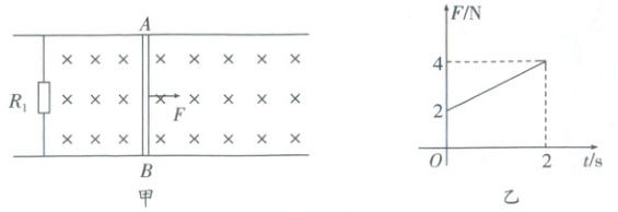 如图甲所示,足够长的光滑平行金属导轨固定在水平桌面上,匀强磁场垂直于导轨平面向下,导轨电阻不计,其左侧接阻值 $ R_{1} = 12\Omega $ 的定值电阻。质量 $ m = 1\,kg $,阻值 $ R_{2} = 6\Omega $ 的金属杆 $ AB $ 置于轨道上,与轨道垂直且接触良好,杆受到水平拉力 $ F $ 的作用,力 $ F $ 随时间 $ t $ 变化的图像如图乙所示。杆由静止开始做匀加速直线运动,$ t = 2\,s $ 时撤去 $ F $,关于杆从静止开始的整个运动过程,下列说法正确的是(