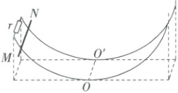 如图所示,两条相同的半圆光滑金属导轨固定在水平桌面上,半径为 $ L $,其所在平面竖直且平行,间距为 $ d $,导轨最高点到水平桌面的距离等于半径,最低点的连线 $ OO' $ 与导轨所在竖直面垂直。空间充满竖直向下的磁感应强度为 $ B $ 的匀强磁场(图中未画出),导轨左端由阻值为 $ r $ 的电阻连接,现将质量为 $ m $、长度也为 $ d $、电阻为 $ R $ 的金属棒 $ MN $ 平行 $ OO' $ 放置在导轨图示位置,由静止释放。$ MN $ 运动过程中始终平行于 $ OO' $ 且与两导轨接触良好,不考虑自感影响,不计导轨电阻,下列说法正确的是(