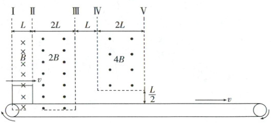 一条水平传送带匀速转动,速度大小为v,方向如图所示。竖直虚线边界Ⅰ、Ⅱ、Ⅲ、Ⅳ、Ⅴ之间存在如图所示的匀强磁场,水平间距已在图中标出。边界Ⅰ、Ⅱ间磁感应强度大小为B,方向垂直于纸面向里;边界Ⅱ、Ⅲ间磁感应强度大小为2B,方向垂直于纸面向外;边界Ⅳ、Ⅴ间磁感应强度大小为4B,方向垂直于纸面向外。磁场区域的下边界水平,如图所示。其中磁感应强度为4B的磁场区域下边界与传动带的距离为$\frac{L}{2}$。传送带左侧有一质量为M、边长为L、电阻为R的正方形金属线框。最初线框左侧与边界Ⅰ重合,初速度大小也为v,方向水平向右。已知线框经过边界Ⅱ的过程中,与传送带间刚好不发生相对滑动,最大静摩擦力认为与滑动摩擦力相等,重力加速度为g。求:
