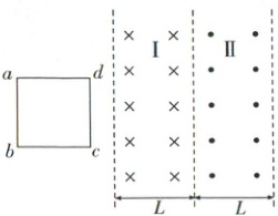 如图所示,一边长为L的正方形线圈置于光滑绝缘水平面上,线圈右侧存在竖直方向的匀强磁场Ⅰ和Ⅱ,两磁场的宽度均为L,磁感应强度大小均为B,方向如图所示。线圈的cd边与磁场边界平行。现给线圈一水平向右的初速度$v_{0}$,当线圈全部进入磁场Ⅱ时速度恰好为零,下列说法正确的是(