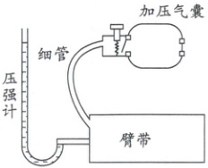 经典真题 1(充气问题) (2021·山东卷) 血压仪由加压气囊、臂带、压强计等构成,如图所示。加压气囊可将外界空气充入臂带,压强计示数为臂带内气体的压强高于大气压强的数值。充气前臂带内气体压强为大气压强,体积为$V$;每次挤压气囊都能将$60\ cm^3$的外界空气充入臂带中,经$5$次充气后,臂带内气体体积变为$5V$,压强计示数为$150\ mmHg$。已知大气压强等于$750\ mmHg$,气体温度不变。忽略细管和压强计内的气体体积,则$V$等于(