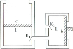 巩固训练 5(充气问题) (2025·山东潍坊一模) 如图所示,某实验小组设计了一种简易气压升降装置。汽缸Ⅰ竖直放置,体积为$2V_{0}$,质量$m = \frac{p_{0}S}{g}$的活塞$a$($S$为活塞横截面积)静止在汽缸Ⅰ的中间位置,封闭气体的体积为$V_{0}$。汽缸Ⅱ水平放置,封闭气体的体积为$V_{0}$,压强为$p_{0}$,通过单向阀门$K_{2}$与大气连通,活塞$b$向左推动时,$K_{2}$关闭;向右拉动时,$K_{2}$打开。两汽缸通过体积不计的管道连通,管道左端有单向阀门$K_{1}$,只有汽缸Ⅱ中气体压强大于汽缸Ⅰ中气体压强时,$K_{1}$才能打开。汽缸Ⅱ右侧的活塞$b$每缓慢推一次,都能将体积为$V_{0}$、压强为$p_{0}$的气体全部压入汽缸Ⅰ中,活塞$a$上升到汽缸Ⅰ顶端时会被卡住。大气压强为$p_{0}$,重力加速度为$g$,不计活塞与汽缸之间的摩擦及活塞的厚度,两汽缸导热良好,环境温度保持不变,求: