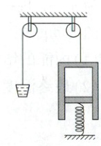 巩固训练 4 单活塞+弹簧+滑轮(2025·黑吉辽二模)如图,汽缸通过滑轮与装有水的水桶悬吊在空中,汽缸内通过与弹簧相连的活塞封闭了一定质量的理想气体。开始时整个装置处于静止状态,弹簧处于原长状态。现通过水桶底部的遥控阀门将水缓慢放出,直至水完全放出。已知汽缸质量为 $m_1$,活塞质量为 $m_2$,活塞横截面积为 $S$,弹簧劲度系数为 $k$。开始时气柱长为 $L$,水完全流出时,弹簧压缩量为 $x_0$,大气压强为 $p_0$,重力加速度为 $g$,全过程气体温度保持不变,忽略各处阻力。求:
