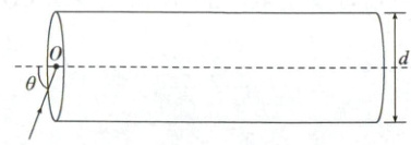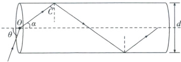 3. (2024·山东烟台二模)光导纤维是一种利用全反射规律使光线沿着弯曲路径传播的光学元件。如图所示为某一光导纤维(可简化为圆柱形长玻璃丝)的示意图,玻璃丝长度L = 50\ km,直径为$d = 2\ \mum,$折射率为n = 1.25。已知光在真空中的传播速度为$c = 3.0× 10^{8}\ m/s,$$\sin 37^{\circ}=0.6,$则: