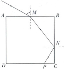 1. (2022·全国甲卷)如图,边长为a的正方形ABCD为一棱镜的横截面,M为AB边的中点。在截面所在的平面,一光线自M点射入棱镜,入射角为$60^{\circ},$经折射后在BC边的N点恰好发生全反射,反射光线从CD边的P点射出棱镜,求棱镜的折射率以及P、C两点之间的距离。