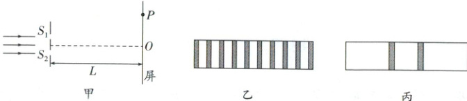 (2022·山东卷)(多选)某同学采用图甲所示的实验装置研究光的干涉与衍射现象,狭缝$S_1$、$S_2$的宽度可调,狭缝到屏的距离为$L$。同一单色光垂直照射狭缝,实验中分别在屏上得到了图乙、图丙所示图样。下列描述正确的是(