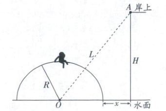 巩固训练 3 等时圆模型 + 运动学公式 (2025·江西重点中学协作体联考) 某次洪灾紧急救援行动中,江西鹰潭蓝天救援队发现一灾民被困在水中礁石上。如图所示,礁石可看作一半球,其最高点纵截面圆心为 $O$,半径为 $R$,离礁石最近的岸上有一定点 $A$,已知 $A$ 点距离水面高为 $H$,$OA = L$,水面上礁石最右端离岸水平距离 $x<H$ ($x$ 未知),现设计从 $A$ 点架设一条倾斜的光滑滑道到礁石上,要求救援队员从滑道顶端由静止下滑到达礁石表面所用时间最短,则最短时间为 (
