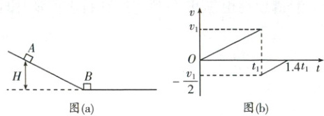 压轴挑战 5 斜面模型 + 弹性碰撞 + 功能关系 (2019·全国 I 卷) 竖直面内一倾斜轨道与一足够长的水平轨道通过一小段光滑圆弧平滑连接,小物块 $B$ 静止于水平轨道的最左端,如图 (a) 所示。$t = 0$ 时刻,小物块 $A$ 在倾斜轨道上从静止开始下滑,一段时间后与 $B$ 发生弹性碰撞 (碰撞时间极短);当 $A$ 返回到倾斜轨道上的 $P$ 点 (图中未标出) 时,速度减为 $0$,此时对其施加一外力,使其在倾斜轨道上保持静止。物块 $A$ 运动的 $v - t$ 图像如图 (b) 所示,图中的 $v_{1}$ 和 $t_{1}$ 均为未知量。已知 $A$ 的质量为 $m$,初始时 $A$ 与 $B$ 的高度差为 $H$,重力加速度大小为 $g$,不计空气阻力。
