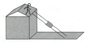 巩固训练 4 空间三维模型 + 组合斜面 (2025·河北邯郸模拟) 如图所示,工人师傅自房檐向水平地面运送瓦片,他将两根完全一样的直杆平行固定在房檐和地面之间当成轨道,瓦片沿轨道滑动时,其垂直于直杆的截面外侧为半径为 $0.1$ m 的圆弧。已知两直杆之间的距离为 $\dfrac{\sqrt{2}}{10}$ m,房檐距地面的高度为 $4$ m,两直杆在房檐和地面之间的长度 $L = 8$ m,忽略直杆的粗细,最大静摩擦力等于滑动摩擦力。工人师傅将瓦片无初速度地放置在轨道顶端,只有瓦片与直杆间的动摩擦因数小于 $\mu_{0}$ (未知) 时,瓦片才能开始沿轨道下滑,$g$ 取 $10$ m/s²。