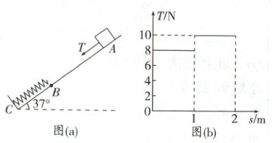 经典真题2 斜面弹簧模型+牛顿第二定律+动能定理 (2021·福建卷)如图(a),一倾角为$37^{\circ}$的固定斜面的$AB$段粗糙,$BC$段光滑.斜面上一轻质弹簧的一端固定在底端$C$处,弹簧的原长与$BC$长度相同.一小滑块在沿斜面向下的拉力$T$作用下,由$A$处从静止开始下滑,当滑块第一次到达$B$点时撤去$T.T$随滑块沿斜面下滑的位移$s$的变化关系如图(b)所示.已知$AB$段长度为$2\ m$,滑块质量为$2\ kg$,滑块与斜面$AB$段的动摩擦因数为$0.5$.弹簧始终在弹性限度内,重力加速度大小取$10\ m/s^2$,$\sin37^{\circ}=0.6$.求:
