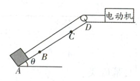 (2)物块在$BC$段匀速运动,得电动机的牵引力为$F = mg\sin \theta + \mu mg\cos \theta$,