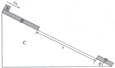 经典模拟 1 (斜面模型 + 板块模型 + 分离问题 + 动量守恒)(2025·河北保定一模)如图所示,倾角为$\theta$的斜面 C 固定在水平面上,质量为$m$、长度为$2L$的木板 B 恰能静止在斜面顶端,木板 B 与斜面底端固定平台 D 的厚度相同,其下端到固定平台 D 的距离为$s$。一质量为$2m$的物块 A(可视为质点)以方向平行斜面向下、大小$v_0 = 3\sqrt{gL\sin\theta}$的初速度从上端滑上木板 B,木板 B 与平台 D 碰撞后立即停止运动。已知最大静摩擦力等于滑动摩擦力,物块 A 与木板 B 间的动摩擦因数是木板 B 与斜面 C 间的动摩擦因数的 2 倍,重力加速度为$g$。