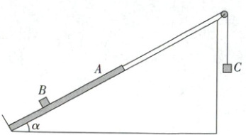 压轴挑战 4 (斜面模型 + 板块模型 + 轻绳连接体 + 运动规律)(2025·浙江宁波期中)如图,倾角为$\alpha = 30^{\circ}$的光滑斜面固定在水平面上,斜面底端有固定挡板,一质量为$2m$的长木板 A(足够长)放置在斜面上,一根平行斜面的轻绳跨过光滑定滑轮分别连接长木板 A 和重物 C,此时 A 的下端恰好与挡板接触但两者间无挤压。现将一质量为$3m$的滑块 B,在距离长木板 A 的下端$x_0 = 12.5m$处,以初速度$v_0 = 15m/s$放在长木板 A 上,该速度方向沿长木板 A 的上表面向上,当长木板 A 与滑块 B 恰好共速时,绳子突然断开。设长木板 A 与挡板每次碰撞后均以原速率反弹,长木板 A 与滑块 B 间的动摩擦因数为$\mu = \frac{\sqrt{3}}{3}$,最大静摩擦力等于滑动摩擦力。求: