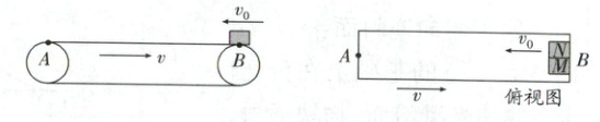 2. (水平传送带问题+临界极值问题+功能关系)(2025·重庆高三大联考)如图所示,水平传送带顺时针转动,速度大小为$v = 4m/s$,$A$、$B$分别为传送带水平部分的左、右端点。某时刻开始,使用简易弹射装置将$M$、$N$两滑块以$v_0 = 3m/s$的速度从右端滑上传送带。已知$M$与传送带之间的动摩擦因数$\mu_1 = 0.5$,$N$与传送带之间的动摩擦因数为$\mu_2 = 0.2$,若传送带长度合适,可使$N$从传送带左端掉落,$M$从传送带右端掉落。$M$、$N$均可视作质点,重力加速度$g$取$10m/s^2$。